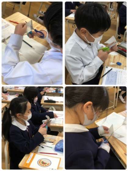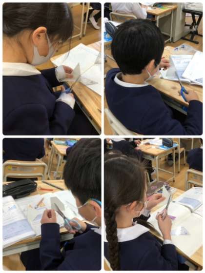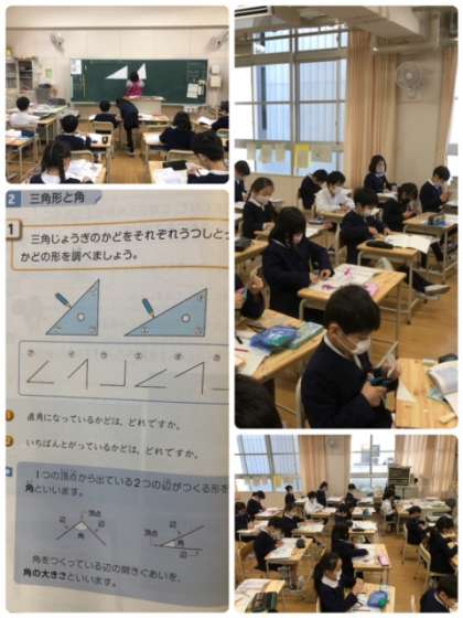 3年生の算数科の授業です。三角形の角を切って何やらしています。何かわかったかな?