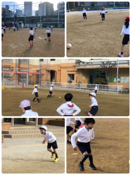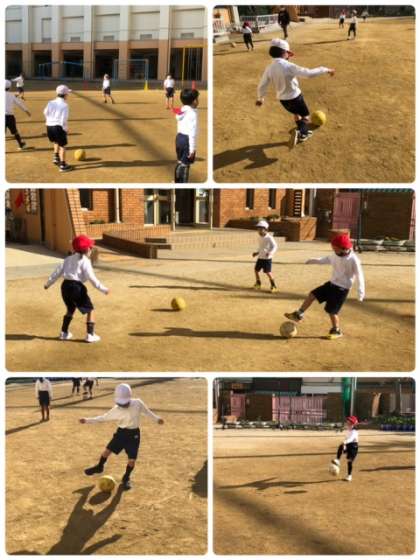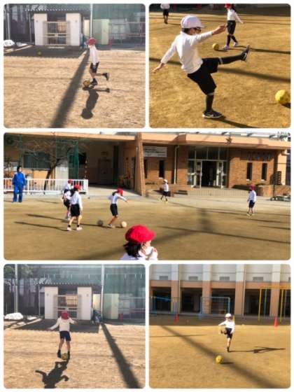 1年1組の子どもたちが、寒さに負けず元気に運動場でボールを蹴っています。しっかり助走をとって、「キック!」