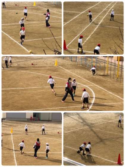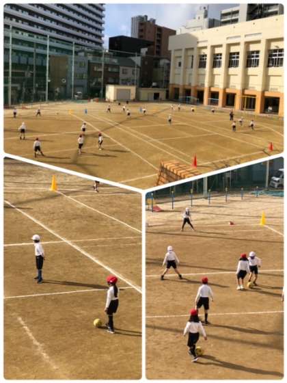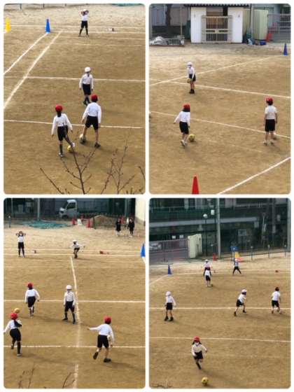 寒さに負けず朝から元気に運動場でサッカーです!相手にボールを取られないように、ドリブルで上手く交わして対岸を目指します。
