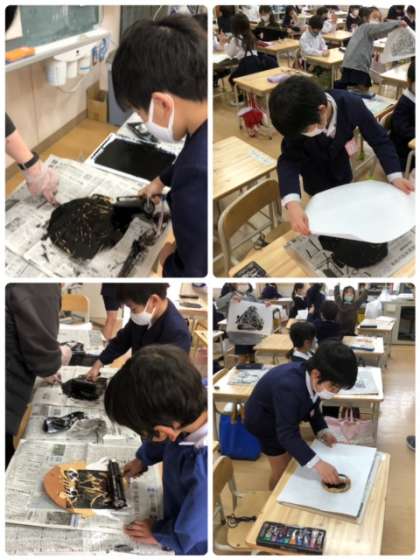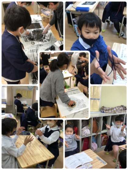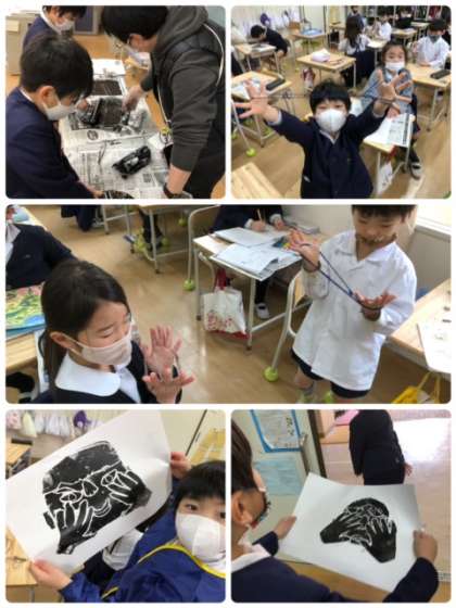 以前より作っていた紙版画の原板が出来上がり、いよいよ版画です!待っている間は、生活科で取り組んでいるあやとりをしています。
