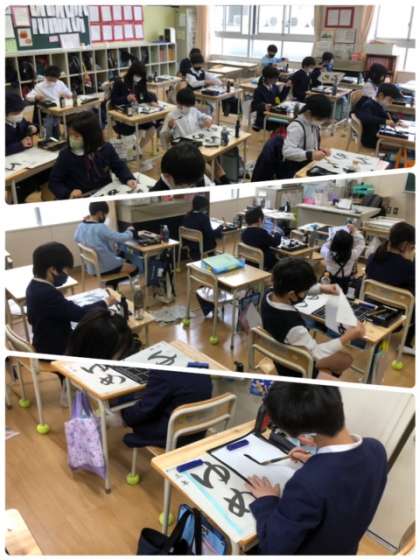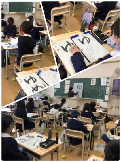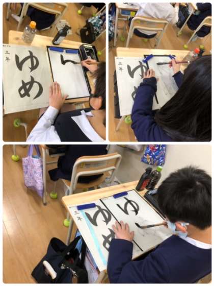 習字の学習です。思ったらよりも難しいひらがな「ゆめ」を書いています。お手本をなぞった後は、いよいよ本番です。