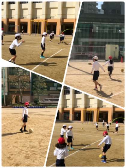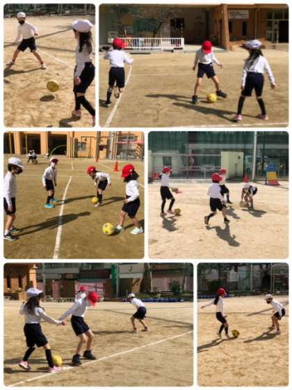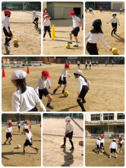 寒空の下、元気に2年生がボールを蹴っています。日々上達しているようで、しっかりと狙って蹴ったり、上手く交わしてドリブルしたりしています。