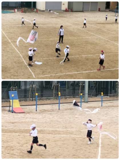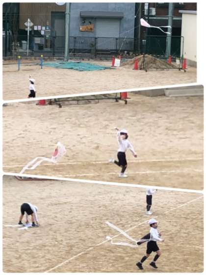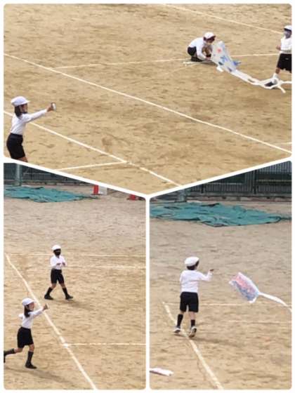 図工科で作った「ぐにゃぐにゃだこ」を運動場で飛ばしました。風もあって、よく飛んでいました。