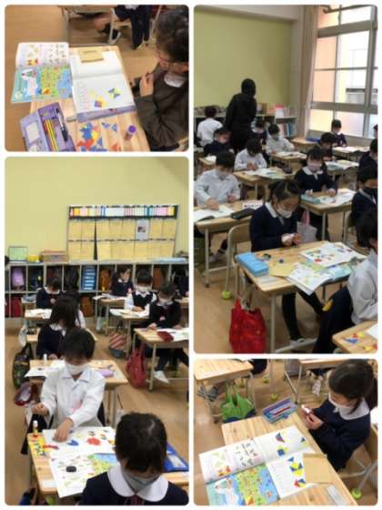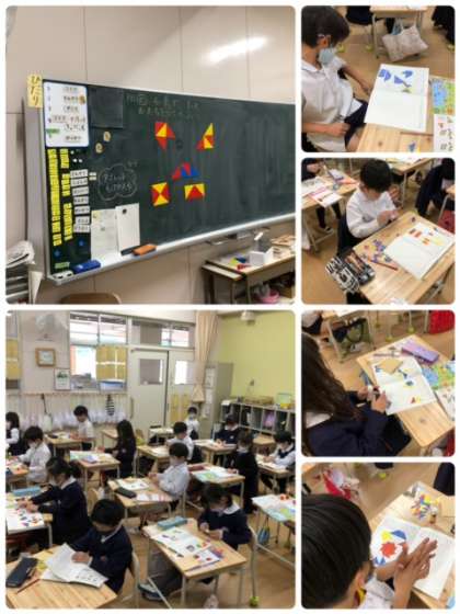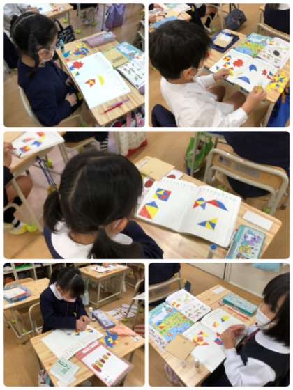 昨日の学習の続きです!いろいろな色の三角形を敷き詰めて形を作っています。