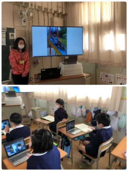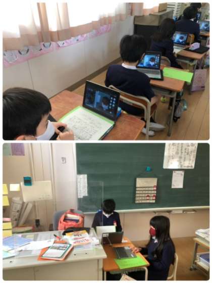 今週末のリモート授業に向けて、教室で最終調整です。1人1台端末を使い、機器の使い方と発表の練習をしていました。当日が楽しみです。