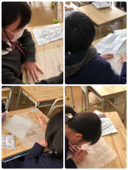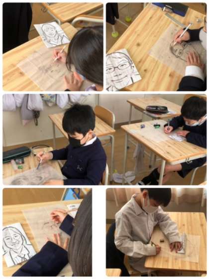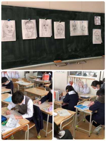 こちらも図工科で自画像を描いています。お手本をよく見て、丁寧に丁寧に描いています。シワや髪の毛までよく見て描いています。