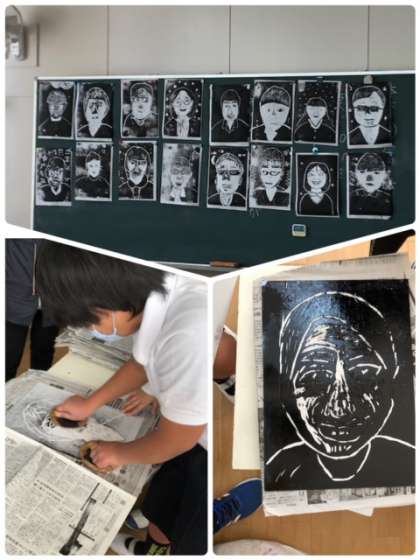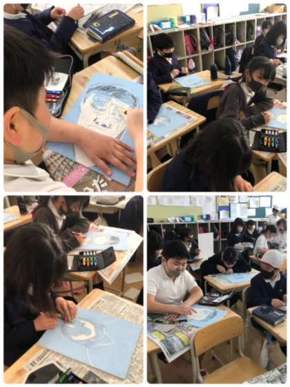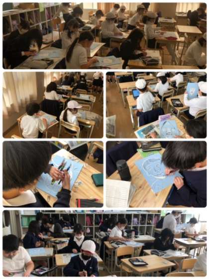 4年生も図工科で彫刻刀を使い自画像を彫っています。それぞれの個性をしっかり出せるように、丁寧に活動を進めています。