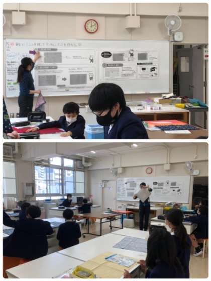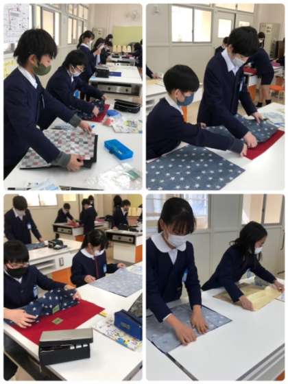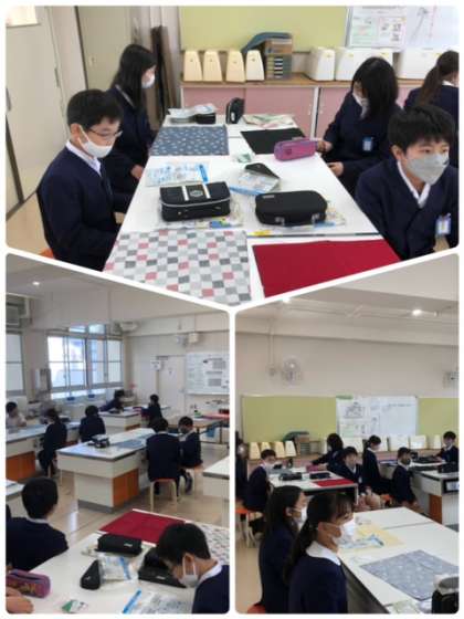 5年生がミシンの学習を活かして、ランチョンマットを作ります。丸井先生の説明を聞いてから作業に移ります。