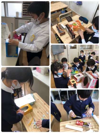 いろいろな箱と紐を使って弦楽器を作ります!イメージはできているようで、どんどんと切ったり、貼ったりしていきます。