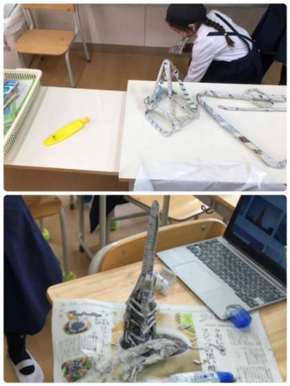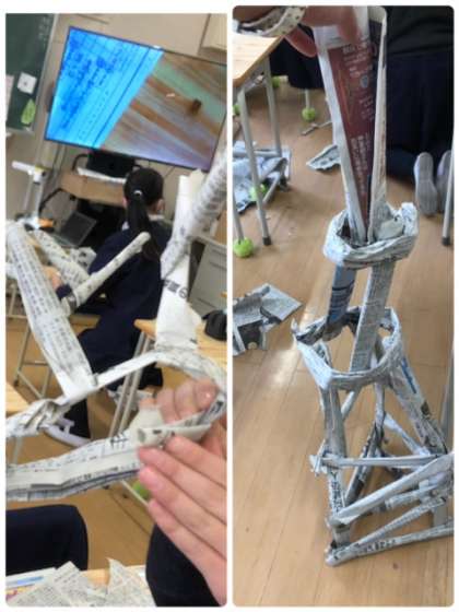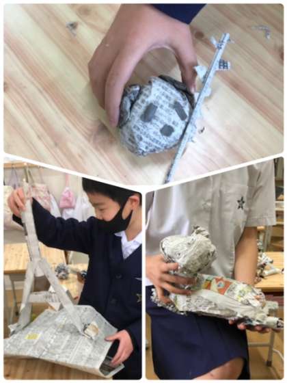 新聞紙だけで、いろいろな物を作ります。ひねったり、ねじったり、丸めたりしながら楽しいものがたくさんできました。