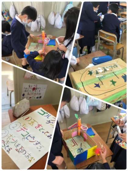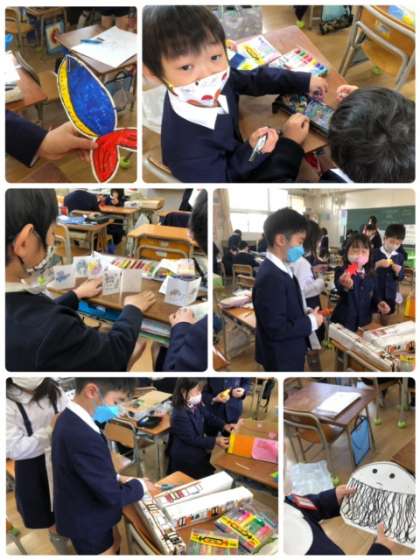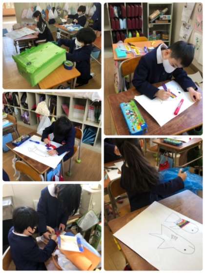 生活科のおもちゃ作りです!みんな貼ったり、切ったり、色を塗ったりと楽しそうに製作中です。