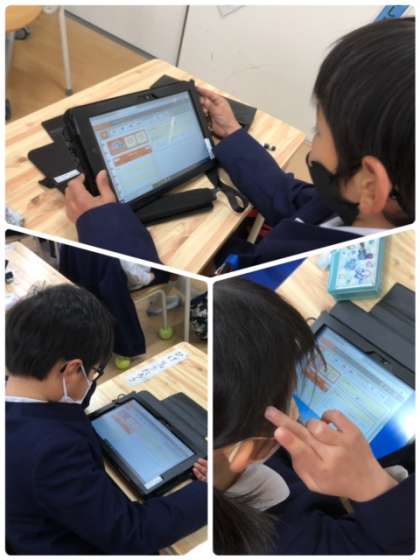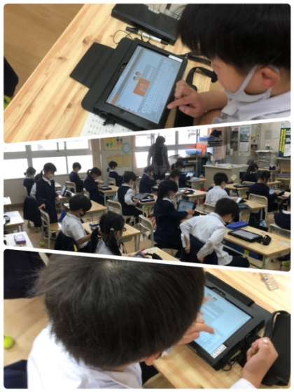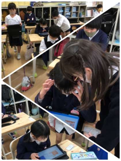 1年1組で、タブレットを使い、新しいアプリを使う練習をしています。友だちと協力、助け合いながら頑張っています。