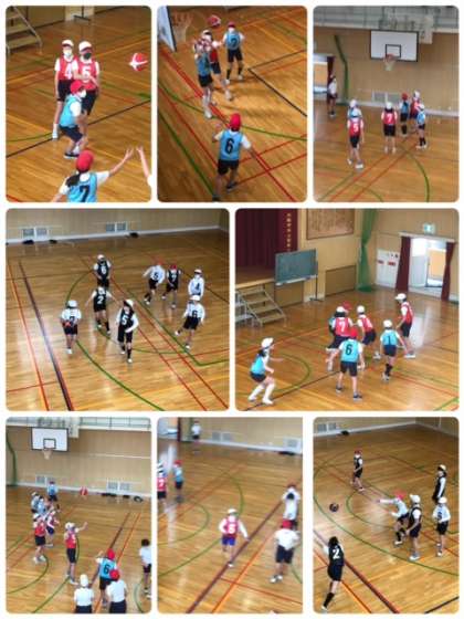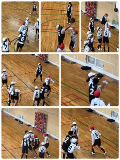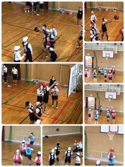 体育科の授業でバスケットボールをしています。上からの様子は白熱そのもの!お互いゴール目指してまっしぐらです!