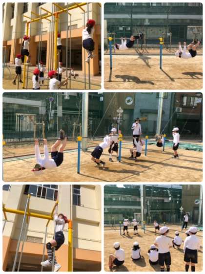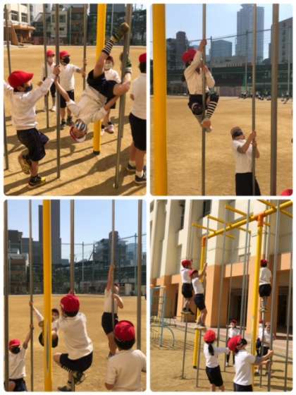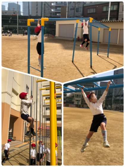 体育で、登り棒や、雲梯、鉄棒をしています。とっても上手になって、できる技を披露してくれました。