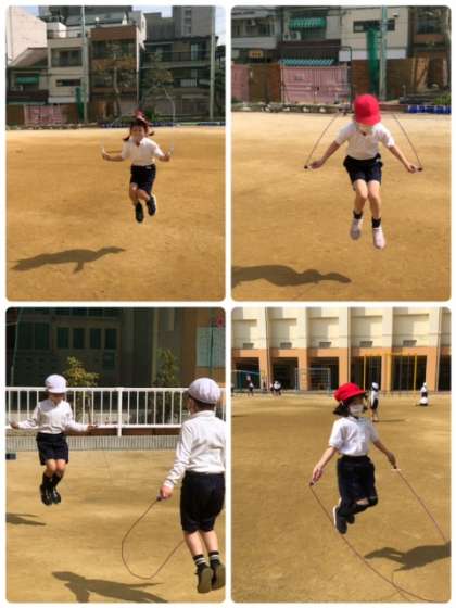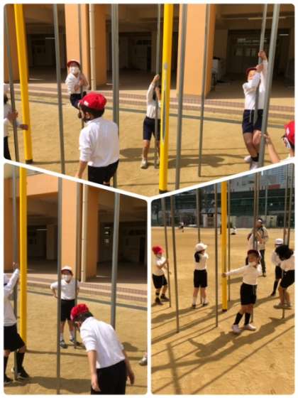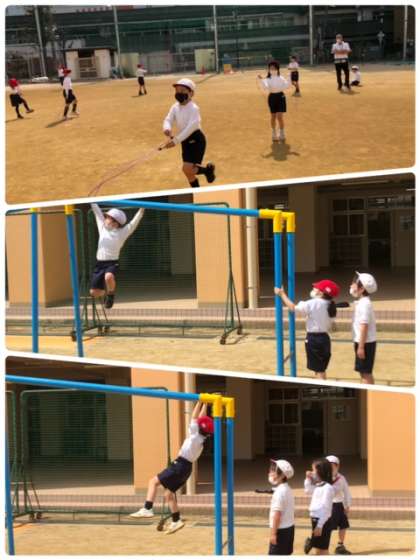 体育の学習で、雲梯や登り棒、縄跳びをしています。みんな一生懸命さをアピールしてくれます。