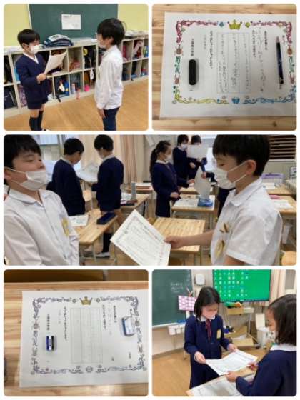 今日は朝から、6年生を祝う会の動画を見ました。とてもクオリティの高い仕上がりで食い入るように見ていました。また、その他の授業では、友だちのいいところを賞状にして渡していました。