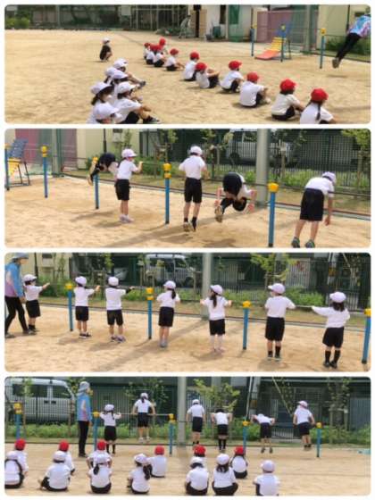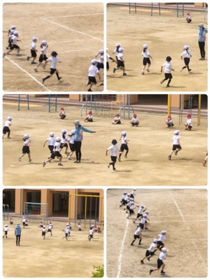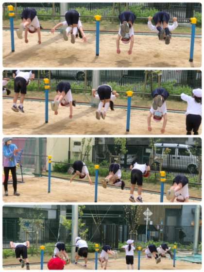 運動場で、かけっこをしたり、鉄棒をしたりと元気に活動をしています。太陽も温かく気持ちよさそうです!