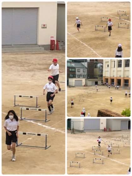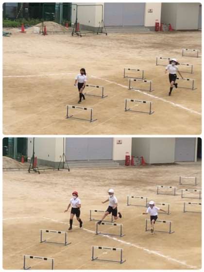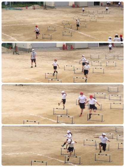 5年生、体育で初めて学習するのはハードル走のようです。リズムよく、インターバルを走りハードルを越えていきます。