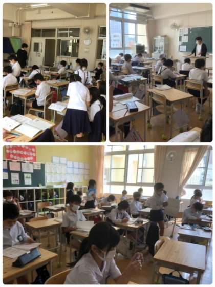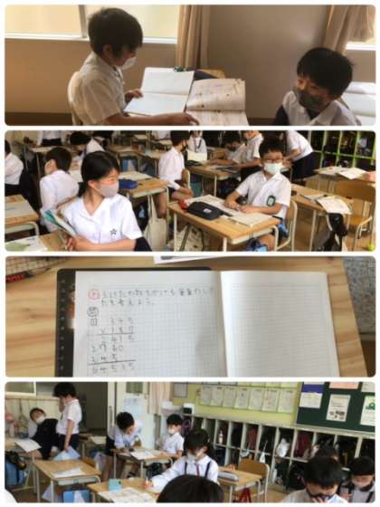 3桁かける3桁のかけ算です。今までの学習より、確かにグレードアップです!しかし、相談しながら、ヒントを見つけ問題解決をしていました。