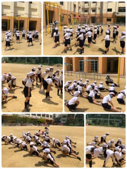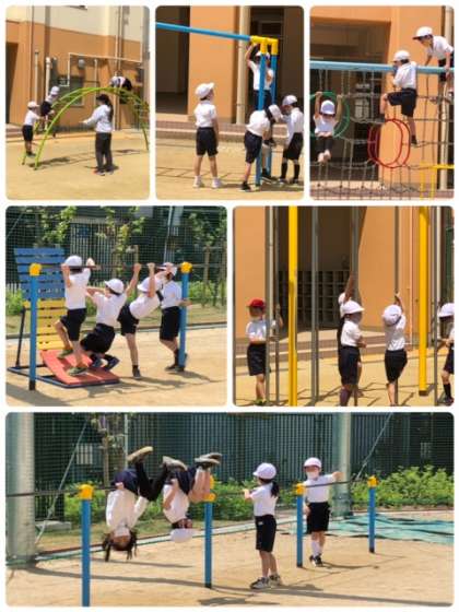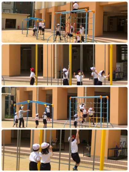 雲梯や鉄棒、登り棒などを使った運動です!一生懸命登り棒の上を目指すのですが、難しい…少し苦戦しているようです。