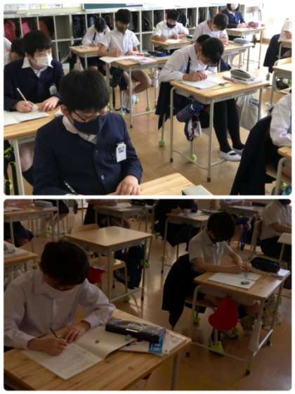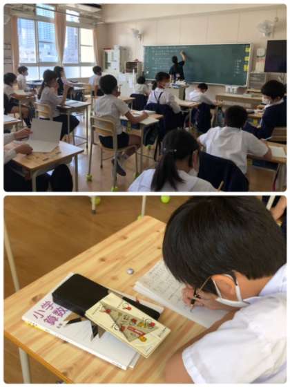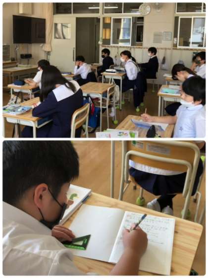 分数のかけ算、わり算の仕方について考えています。図や式で問題解決を目指しています。