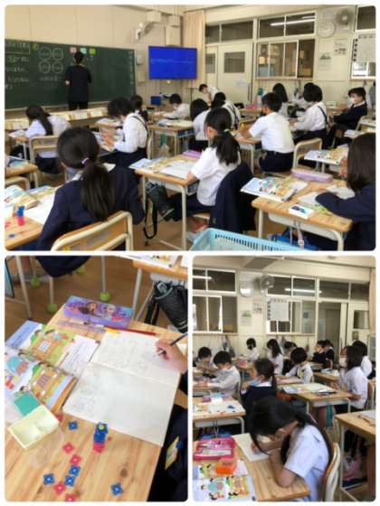 3年生も、具体物を操作してわり算の答えを求めています。