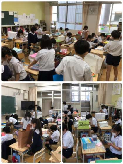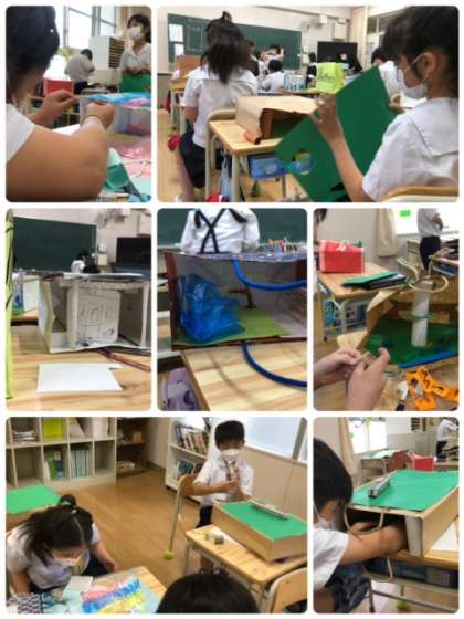 図工で、ふくろの中にいろいろな世界を作っています。電車のホームだったり、木が生えていたりととても楽しい作品ばかりです!