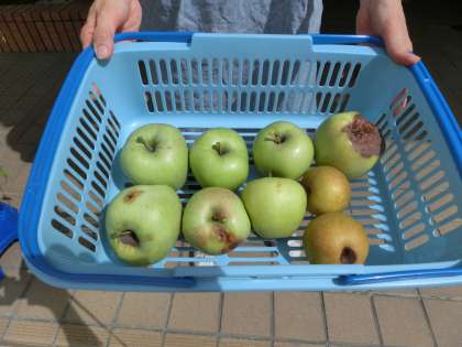 夏休みの暑さの中、リンゴもナシもたくさんの実をつけました。しかし、夏休み中にほとんど落ちてしまいました。