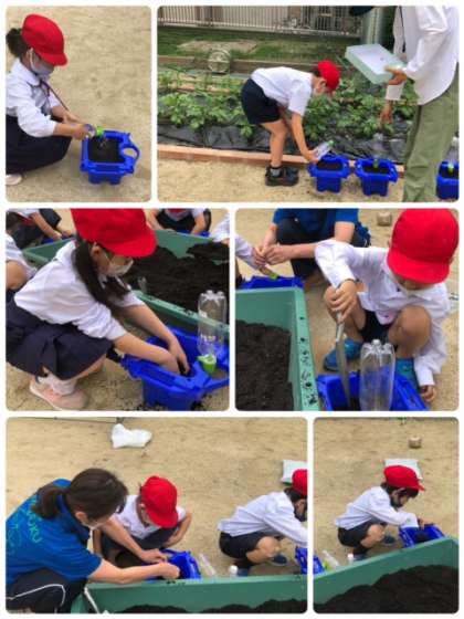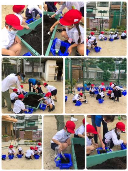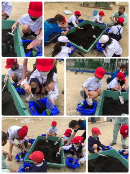 今日は1年2組が、朝顔の種まきをしました。しっかりと土を入れたら、指で穴を開けて種を蒔きます。大きくなあれ!