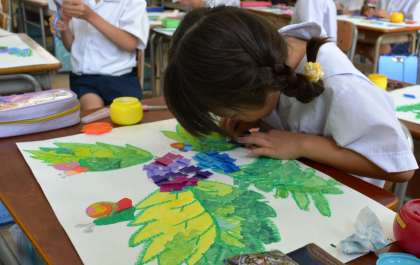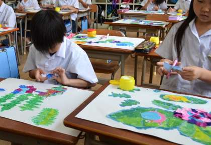 今日は、2年生が図工できれいなアジサイを作っていました。
