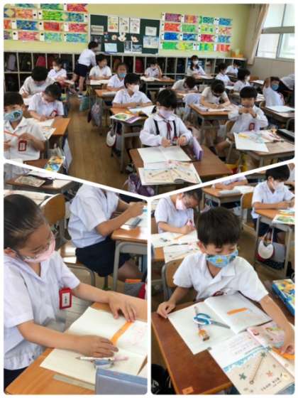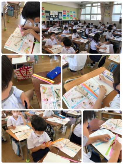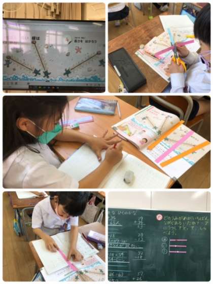 算数科の学習で、長さ比べをしています。テープを使って長さを比べているようです!