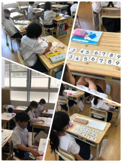 算数セットから、数字のカードを出して10のまとまりを作ろうと頑張っています!