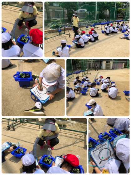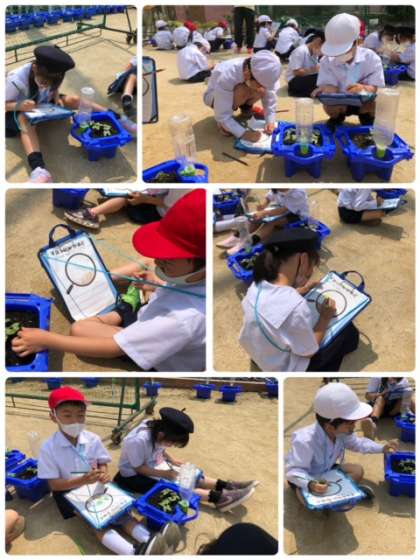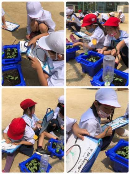 先日植えたアサガオが芽を出したようです。運動場で太陽の下、見て、触ってその様子をスケッチしました。