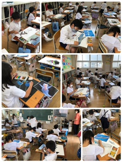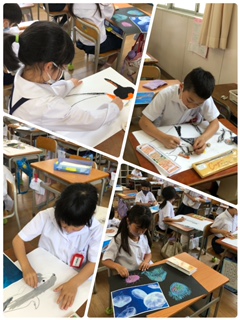 遠足で訪れた海遊館で見た生き物を描いています。いろいろな生き物がいて、とてもおもしろい作品展になりそうです。