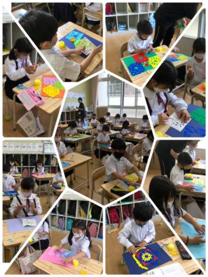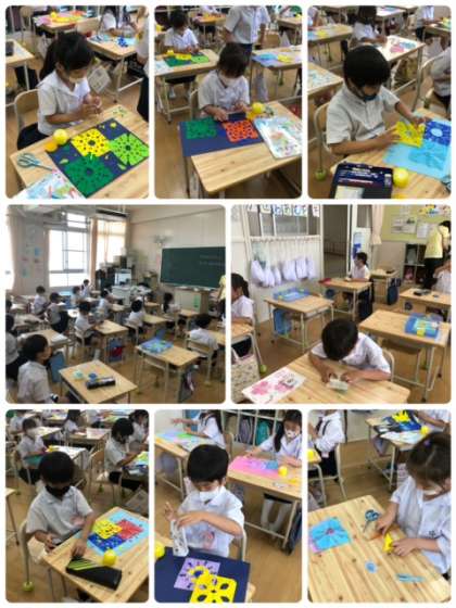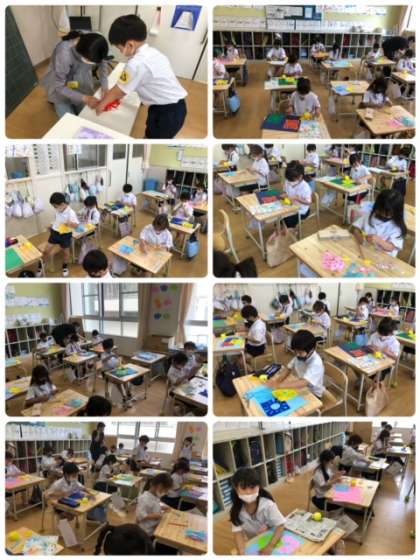 昨日は、折り紙1枚をチョキチョキするので精一杯でしたが、今日は何枚も完成させて画用紙に貼っています。とても綺麗な模様ができています。