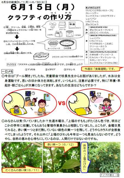 毎日食育通信:プールが始まりました。いつも以上に体調を整えましょう。(6月15日)