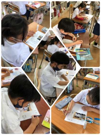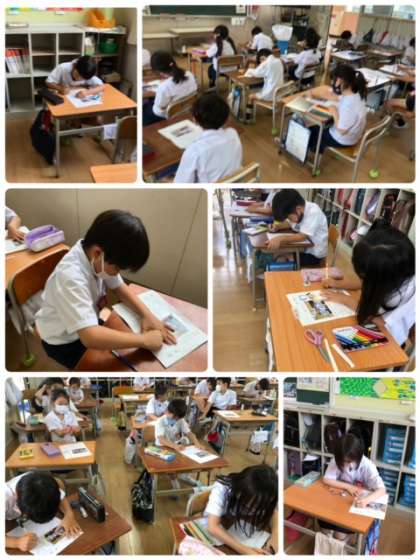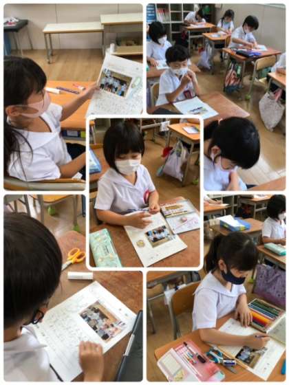 昨日の学校探検を振り返り、ワークシートにまとめています。いろいろな楽しかった感想が書かれていました。