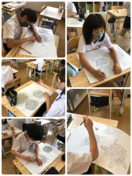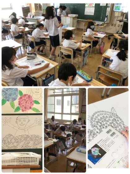 図工科の時間に、アジサイを描いています。タブレットを用いて、花びら1枚から丁寧に丁寧に描いていきます。仕上がりはどうなったかな?