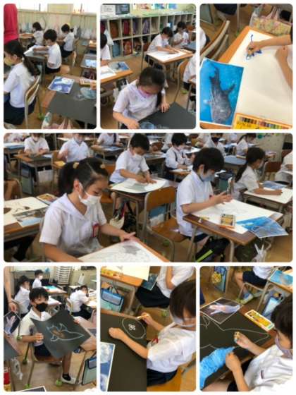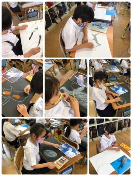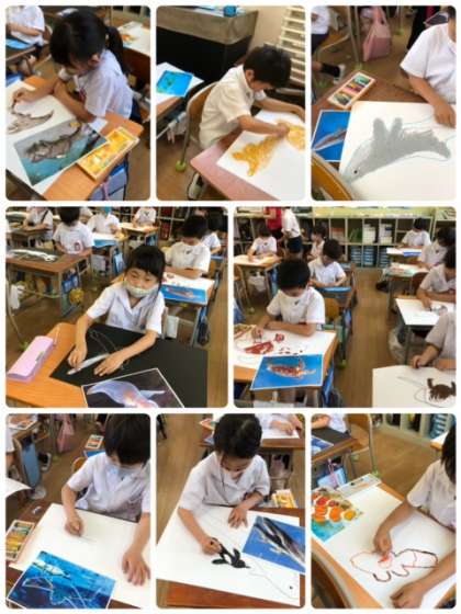 遠足で訪れた海遊館で見た生き物たちを描いています。とっても上手に描けています!完成が楽しみですね!