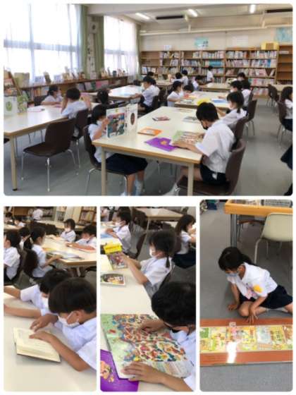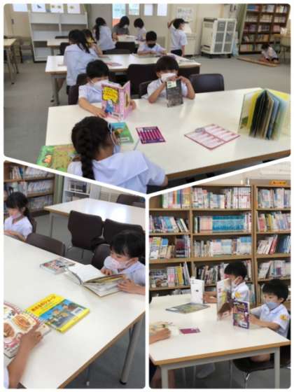 図書館で本を読んでいます!たくさんの本に囲まれて、本選びも大変です。でも、本が見つかると静かに見入っていました。