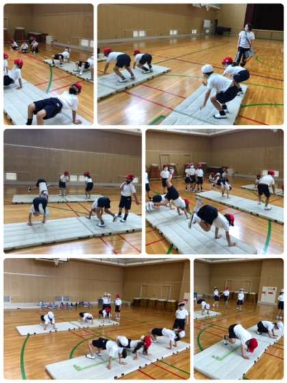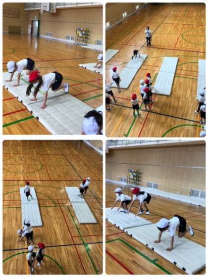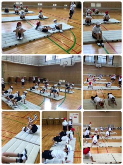 講堂でマット運動の学習です。蜘蛛になったり、ウサギになったりと色々な動物になりながら、マット運動の技を習っています。