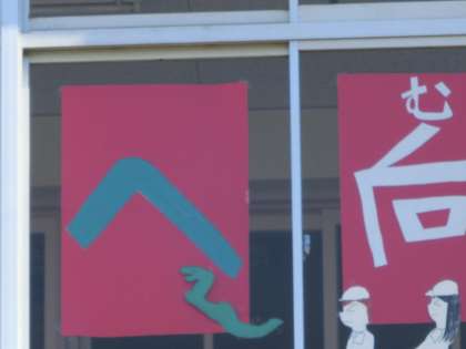 本日の児童朝会で、児童会から運動会のめあての発表がありました。今年は巳年なのでめあての掲示にヘビの絵を入れましたという説明がありました。また、朝会後、全校児童で運動場の石拾いをしました。みんな熱心に拾っていました。