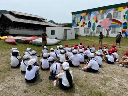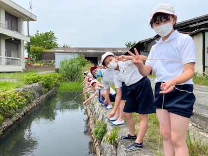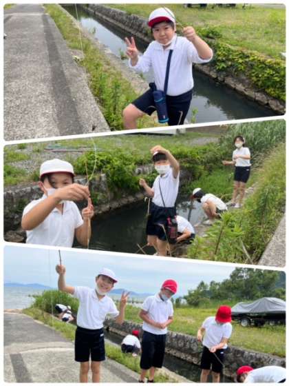昼食を終えて、ザリガニ釣りをし、カッター体験に移ります。