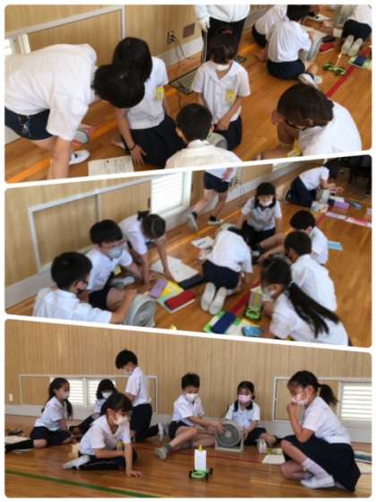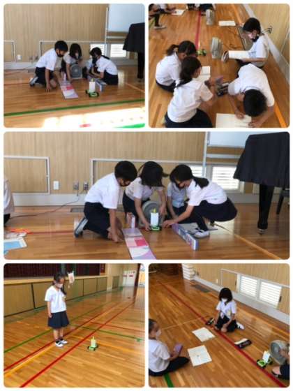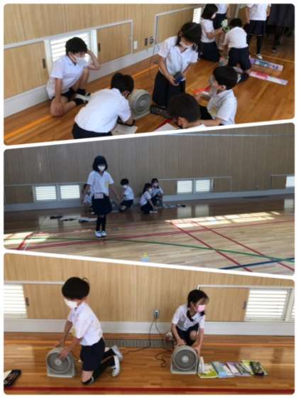 理科の学習で、風について習っています。今日は、サーキュレーターを使って、実験キッドを動かします。力加減でどう動くのか?