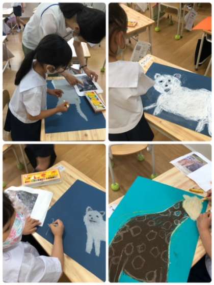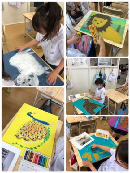 先週から取り組んでいる動物の絵!とってもいい仕上がりになりました。画用紙の色もうまく利用して作品を描いています。