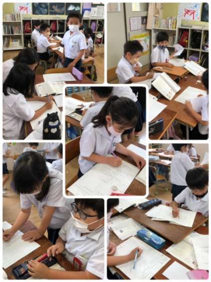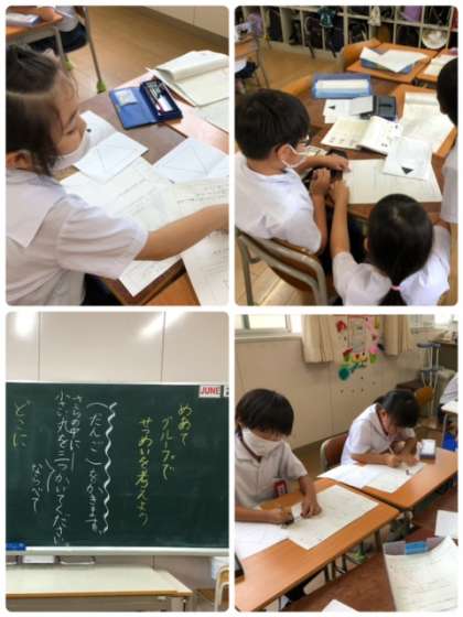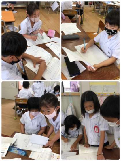 国語科の学習で、説明だけで描きたい物を伝えられるように相談中です。上手く伝わるかなぁ?