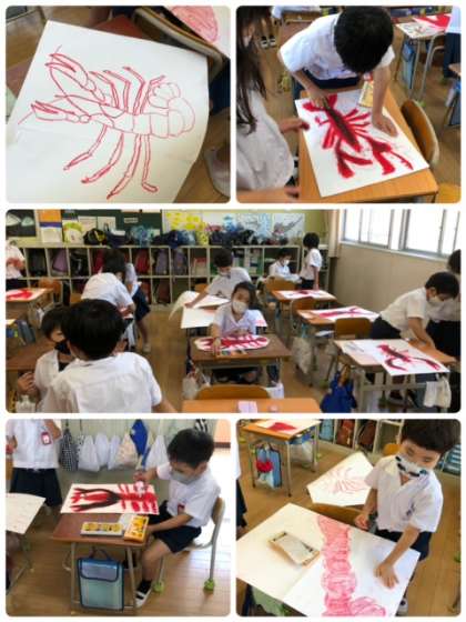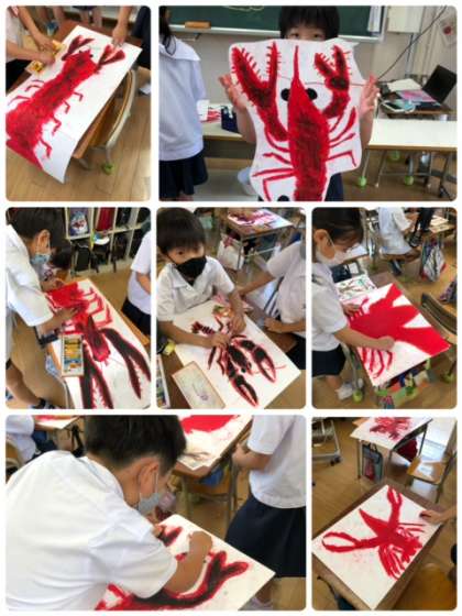ザリガニの絵がまもなく完成しそうです!とにかく迫力あり!画用紙1枚におさまらない作品も!