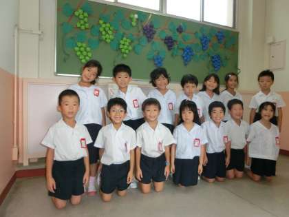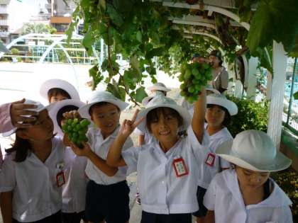 プールの横にあるぶどう棚には、熟れたぶどうの実がいっぱい。先日、1年生がぶどうの収穫をしました。そして、ちょっと味見。とてもおいしかったようです。
