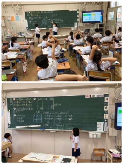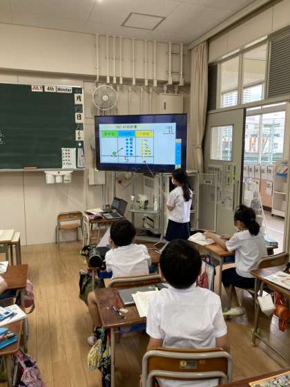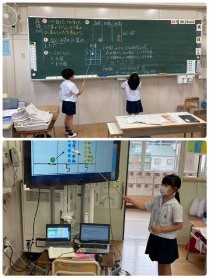 算数科の学習で、タブレットを使って考え方をまとめました!そして、それを大型モニターに、投影し発表しています。