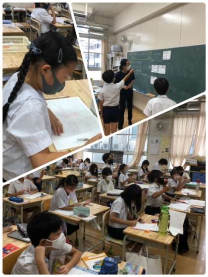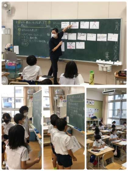 算数科で大きい数の学習をしています。たくさんの考え方を出し合いながら、理解を深めあっていきます。黒板一面にたくさんの考え方が貼り出されました。